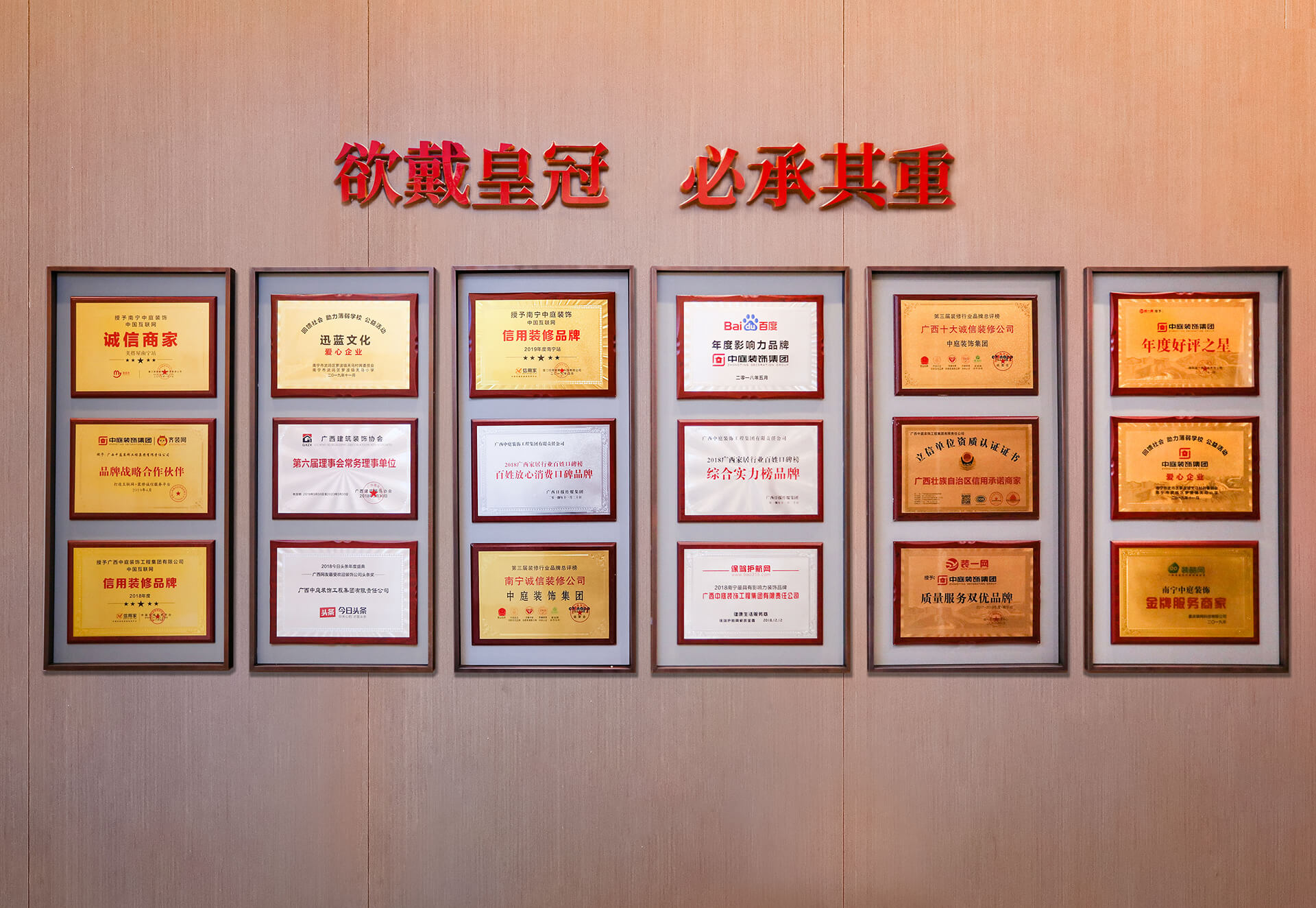 中庭裝飾始終以黨建引領(lǐng)發(fā)展,系南寧市兩新組織黨建工作示范單位。榮膺:中國建筑裝飾協(xié)會會員單位、廣西建筑裝飾協(xié)會副會長單位、廣西家裝行業(yè)唯一"6連A級納稅企業(yè)"、3·15誠信企業(yè)/信用示范企業(yè)/工匠精神品牌等30余項(xiàng)權(quán)威認(rèn)證。